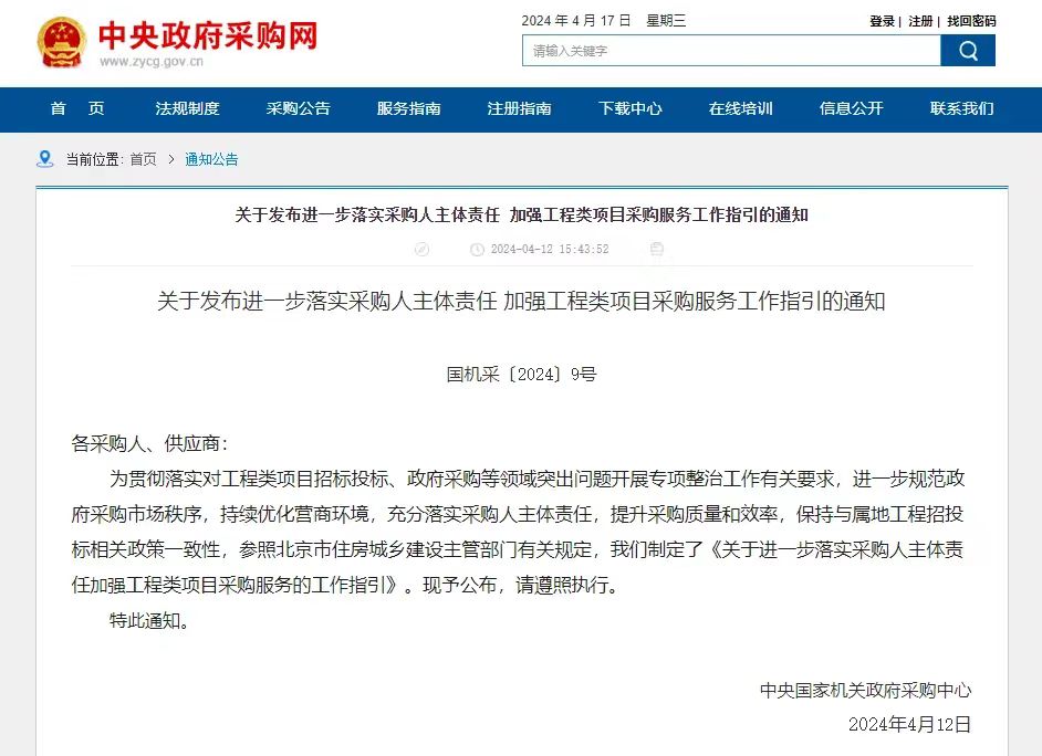 日前,中央國(guó)家機(jī)關(guān)政府采購(gòu)中心印發(fā)《關(guān)于發(fā)布進(jìn)一步落實(shí)采購(gòu)人主體責(zé)任 加強(qiáng)工程類項(xiàng)目采購(gòu)服務(wù)工作指引》(以下簡(jiǎn)稱《指引》),圍繞項(xiàng)目委托階段、文件編制階段、項(xiàng)目評(píng)審階段、采購(gòu)結(jié)果確認(rèn)階段、采購(gòu)結(jié)果公示階段工作,指引采購(gòu)人進(jìn)一步落實(shí)主體責(zé)任。